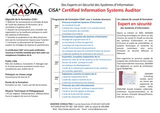 La certification CISA est reconnue mondialement pour les auditeurs de systèmes d'information, nécessitant un examen et cinq ans d'expérience. Akaoma propose une formation intensive en bootcamp, sexprimant sur les standards d'audit et la gouvernance des systèmes d'information, et propose des sessions de révision et des examens blancs. Les participants peuvent également bénéficier d'un accompagnement post-formation et d'un accès à des workshops techniques.