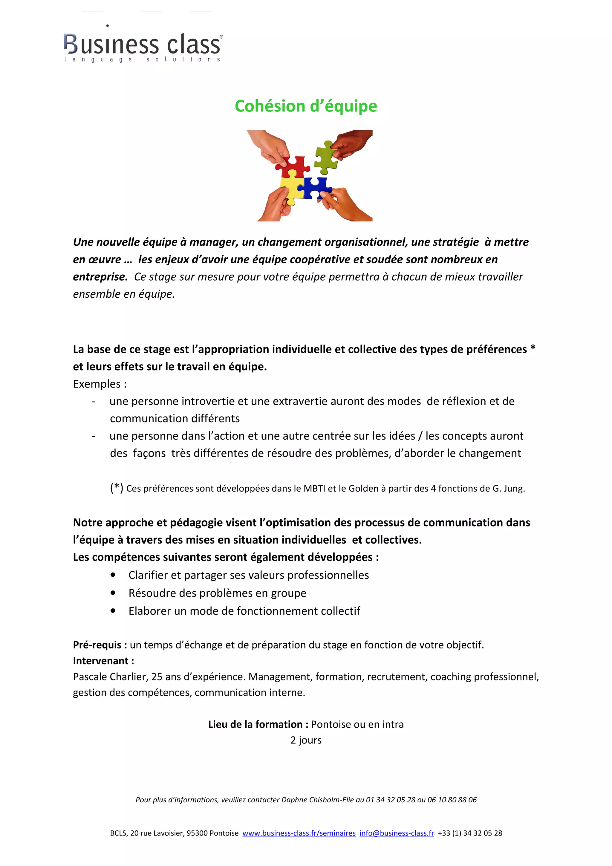 Ce document présente un stage destiné à améliorer la cohésion d'équipe, mettant l'accent sur l'appropriation des préférences individuelles et collectives impactant le travail collaboratif. Les participants apprendront à clarifier leurs valeurs, résoudre des problèmes en groupe et établir un fonctionnement collectif efficace. Le stage est dirigé par Pascale Charlier et se déroule sur deux jours à Pontoise.