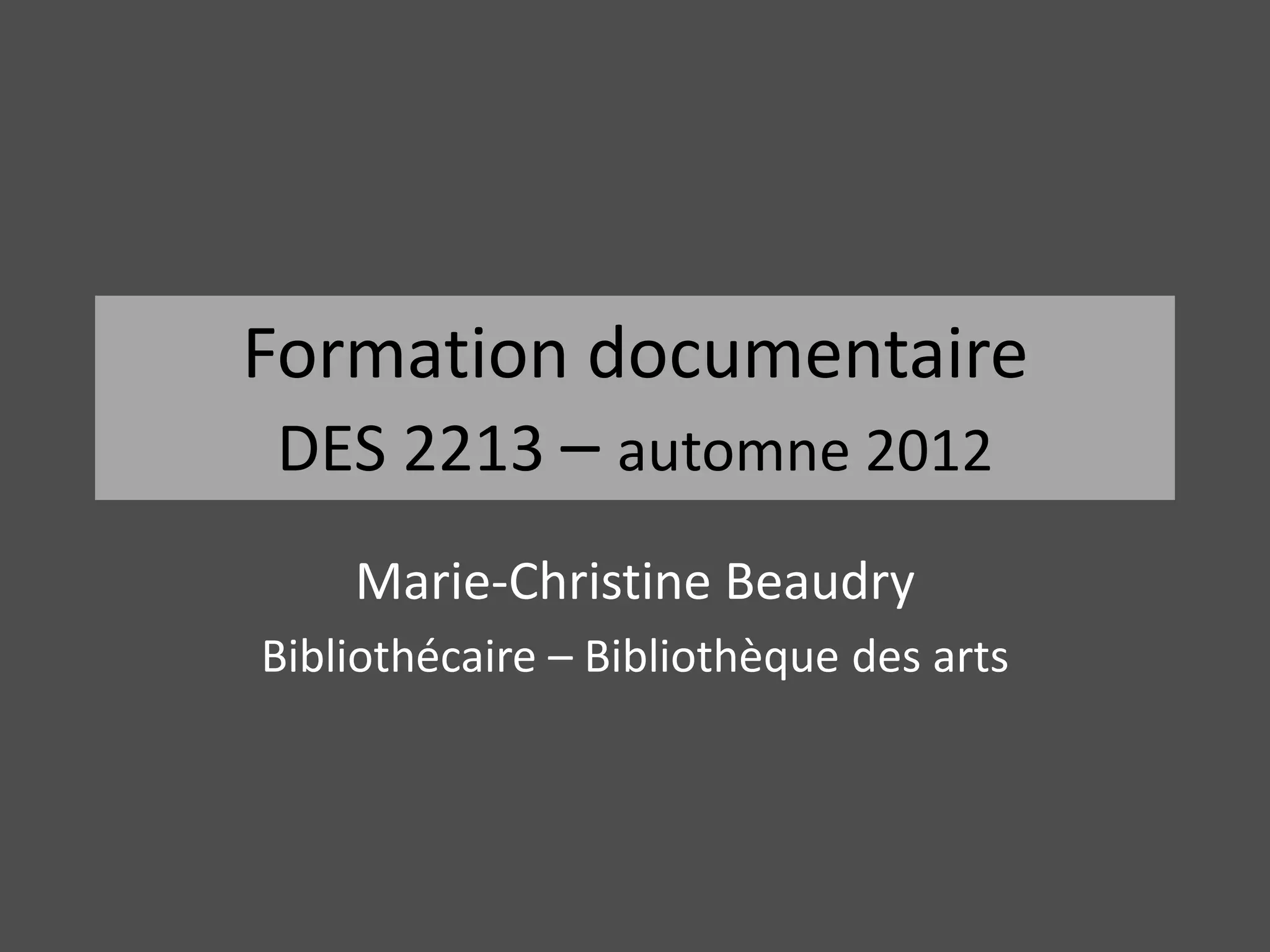 Le document propose une formation documentaire à la bibliothèque des arts, abordant les ressources disponibles, l'utilisation du catalogue et des bases de données, ainsi que les étapes de la recherche documentaire. Il détaille également les types de documents, les méthodes de recherche et les règles de citation. Enfin, il fournit des instructions pour accéder aux ressources électroniques de la bibliothèque.