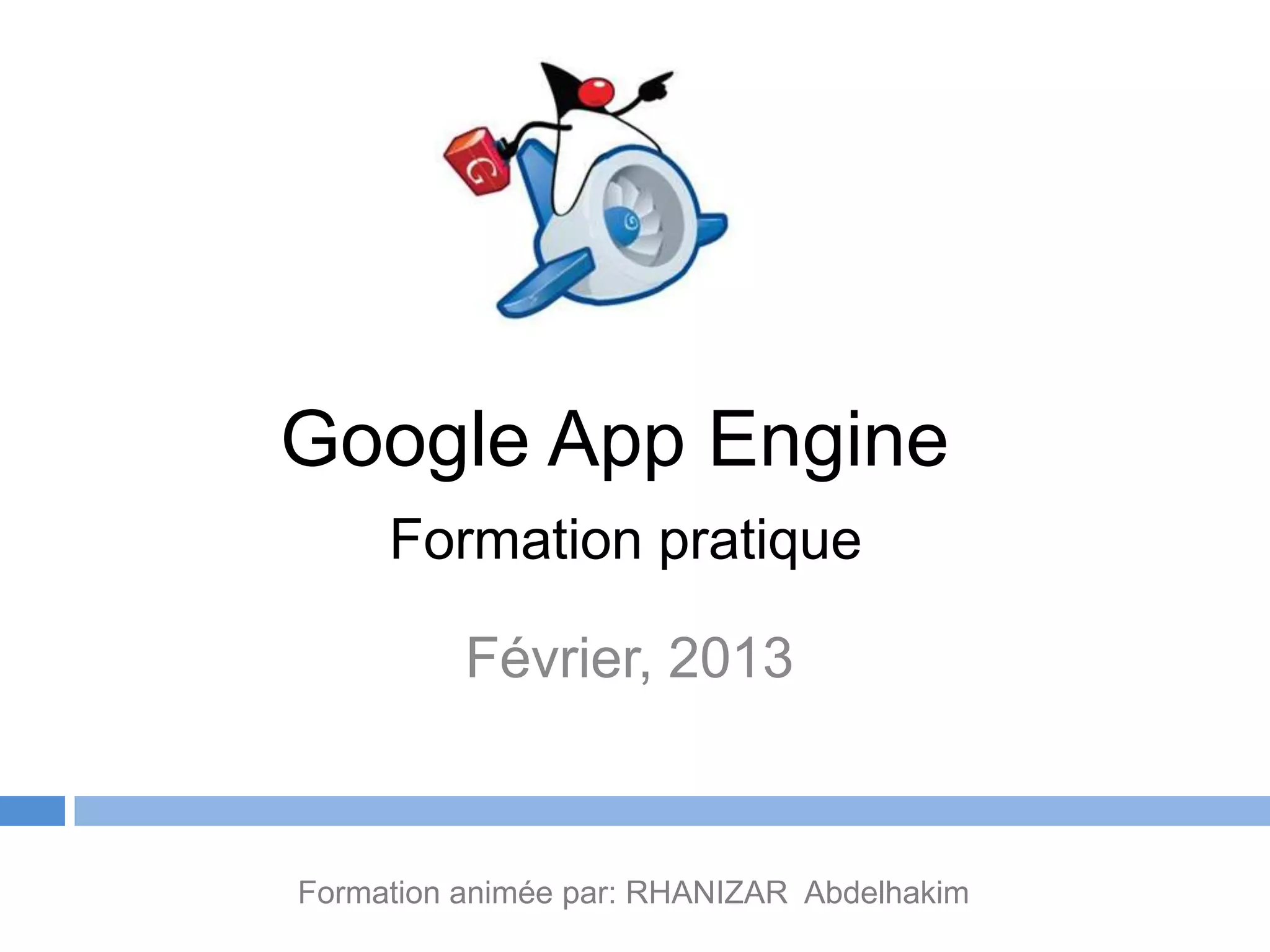 La formation sur Google App Engine (GAE) présente ses objectifs, notamment la familiarisation avec ses services, le développement et le déploiement d'applications web. Elle couvre la présentation générale de GAE, ses avantages, son architecture, ainsi que divers services tels que memcache, task queues et la gestion de la persistance des données via le datastore. Les participants apprendront également à utiliser des services clés et à optimiser leur code pour une meilleure performance sur GAE.