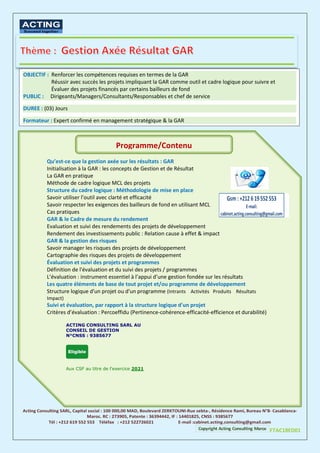 Acting Consulting SARL, basée à Casablanca, se spécialise dans le renforcement des compétences en gestion axée sur les résultats (GAR) pour les projets financés par des bailleurs de fonds publics. Un programme de formation de trois jours est proposé, incluant des méthodes pratiques de cadre logique et des techniques d'évaluation et de suivi des projets de développement. Les participants apprendront à gérer les risques associés et à utiliser efficacement les outils de GAR.