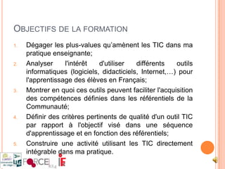 Le document présente une formation sur l'intégration des technologies de l'information et de la communication (TIC) dans l'enseignement du français, visant à en dégager les plus-values pour l'apprentissage. Il aborde l'utilisation d'outils numériques pour améliorer l'interactivité, l'individualisation et l'accessibilité des ressources, tout en discutant des avantages et inconvénients des TIC dans le contexte éducatif. Des exemples pratiques et des références à des outils en ligne sont également fournis pour soutenir les enseignants dans l'intégration des TIC dans leurs cours.