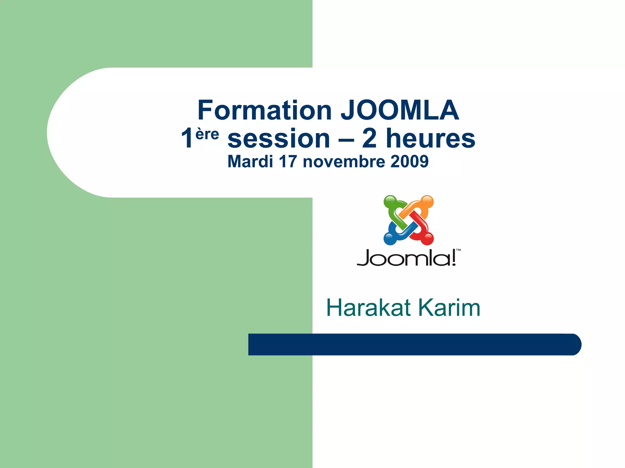 La formation Joomla du 17 novembre 2009 a introduit le CMS Joomla, abordant son historique, son installation locale, et les concepts de base comprenant les modules, composants et templates. Les participants ont appris à créer leur premier site Joomla et à installer le module Joomulus pour dynamiser leur site. La prochaine session est prévue pour le 26 novembre 2009.