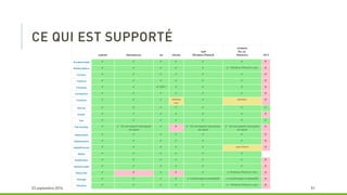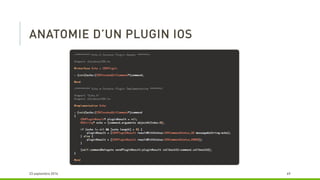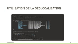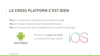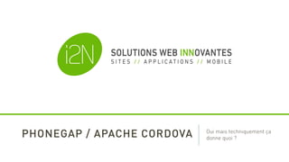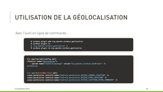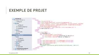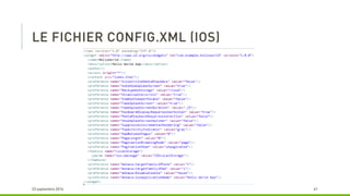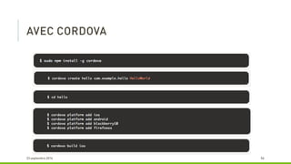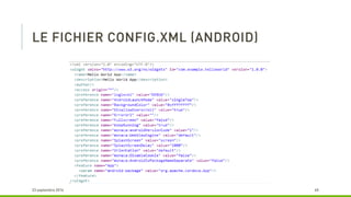 Le document décrit les avantages de l'utilisation de PhoneGap et Cordova pour le développement d'applications multi-plateformes, notamment la réduction du temps de développement et la maintenabilité. Il souligne que ces outils permettent d'utiliser un seul langage (HTML et JavaScript) tout en restant gratuits et open source. Cependant, il mentionne également que le résultat peut ressembler davantage à un site mobile qu'à une application native.