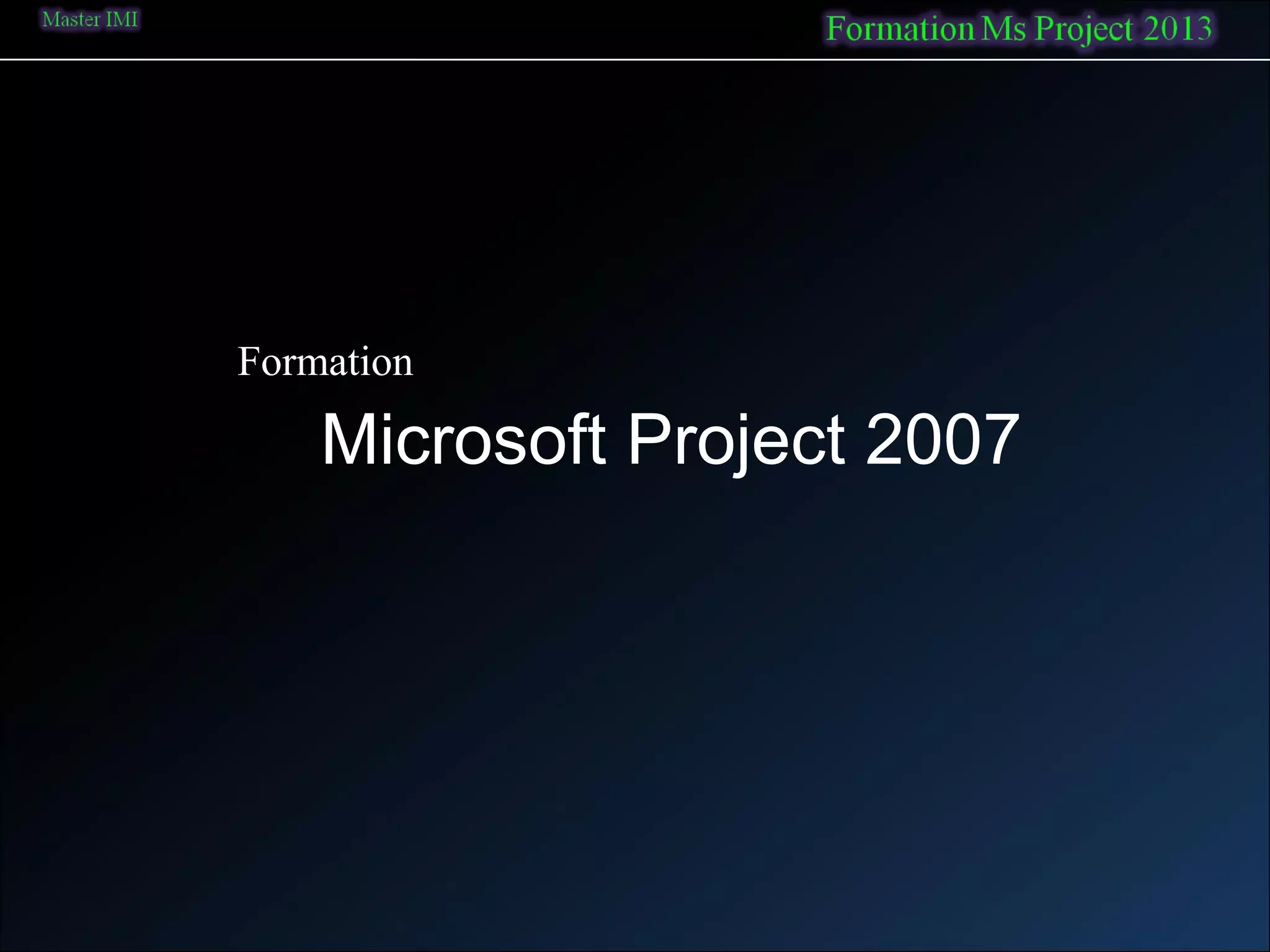 La formation sur Microsoft Project 2007 vise à enseigner l'utilisation du logiciel pour modéliser, planifier, suivre et contrôler des projets, illustré par un projet pédagogique de construction d'un parcours de golf. Elle couvre des aspects clés comme la définition du calendrier de travail, la planification des tâches, la gestion des ressources et des coûts, et l'optimisation des projets. Différents types de tâches et de contraintes sont également expliqués pour une gestion efficace des projets.