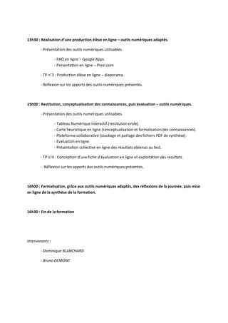 La formation du 18 octobre 2012 portait sur l'intégration des TICE dans l'enseignement d'exploration en économie-gestion, avec un programme structuré en plusieurs sessions pratiques. Les participants ont exploré divers outils numériques pour observer, produire et évaluer des travaux d'élèves en ligne. L'objectif était de renforcer les connaissances sur l'économie numérique et de réfléchir à l'utilisation des outils disponibles dans un cadre éducatif.