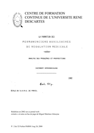 Le document traite de la formation des auxiliaires de régulation médicale pour le SAMU de Paris, créée en 1980 et développée au fil des années par diverses institutions, telles que l'Université René Descartes. Il souligne l'importance d'une équipe pluridisciplinaire dans la conception des programmes de formation, ainsi que l'analyse des tâches et des interactions entre le personnel de régulation médicale et les médecins régulateurs. Des recommandations pour l'amélioration de l'enseignement et la reconnaissance du statut des permanenciers sont également proposées.