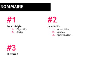 Ce document traite des stratégies et outils pour l'acquisition et l'optimisation du trafic sur internet, en se concentrant sur la visibilité des juniors à travers des newsletters, des blogs et un bon référencement naturel. Il souligne l'importance des réseaux sociaux pour toucher différentes cibles et présente des outils d'analyse pour suivre l'efficacité des stratégies mises en place. Enfin, il aborde la nécessité de définir des objectifs clairs et des indicateurs de performance pour maximiser l'impact des actions menées.