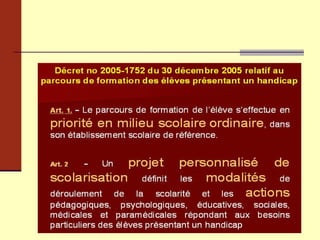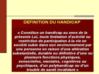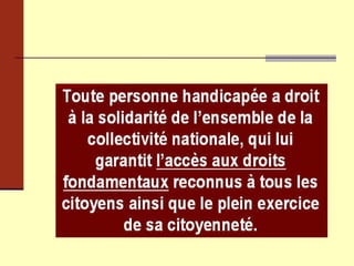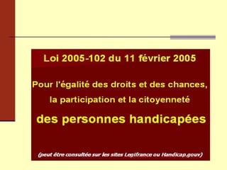 Le document traite de l'accueil des enfants en situation de handicap, en abordant la réalité actuelle du handicap, les évolutions législatives, et les enjeux d'accessibilité et d'égalité des droits. Il souligne l'importance de la scolarisation, la nécessité d'une approche sociétale du handicap, et la transition vers une logique d'autonomie et de compensation. La loi du 11 février 2005 est mise en avant comme un cadre essentiel pour garantir les droits et l'inclusion des personnes handicapées dans la société.
