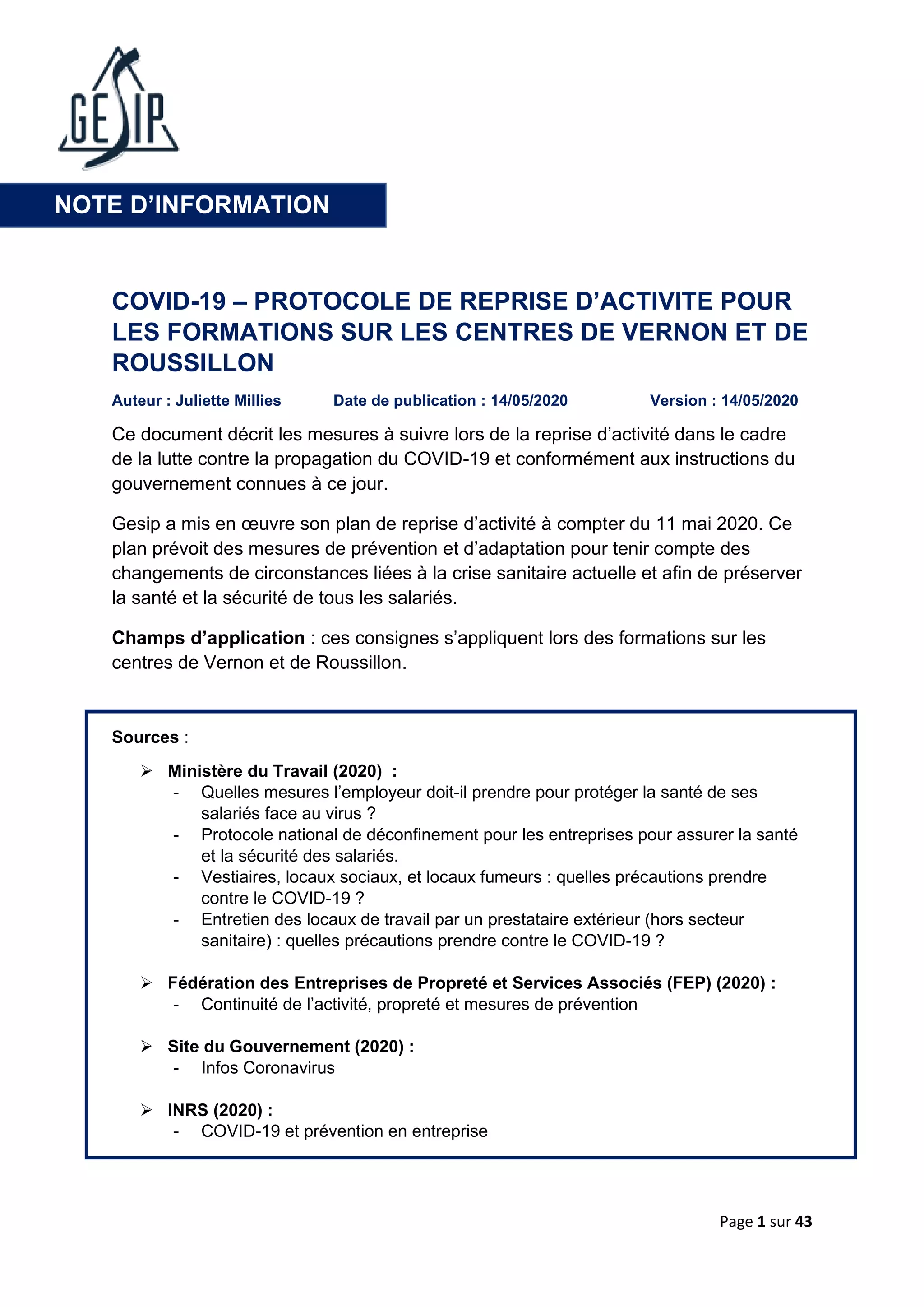 Ce document présente le protocole de reprise d'activité pour les formations dans les centres de Vernon et Roussillon en contexte de Covid-19. Il détaille les mesures de prévention, de sécurité, et les comportements à adopter pour protéger la santé des employés et stagiaires, conformément aux directives gouvernementales. Les consignes incluent la distanciation sociale, l'hygiène renforcée, ainsi que des règles spécifiques pour l'organisation des formations.