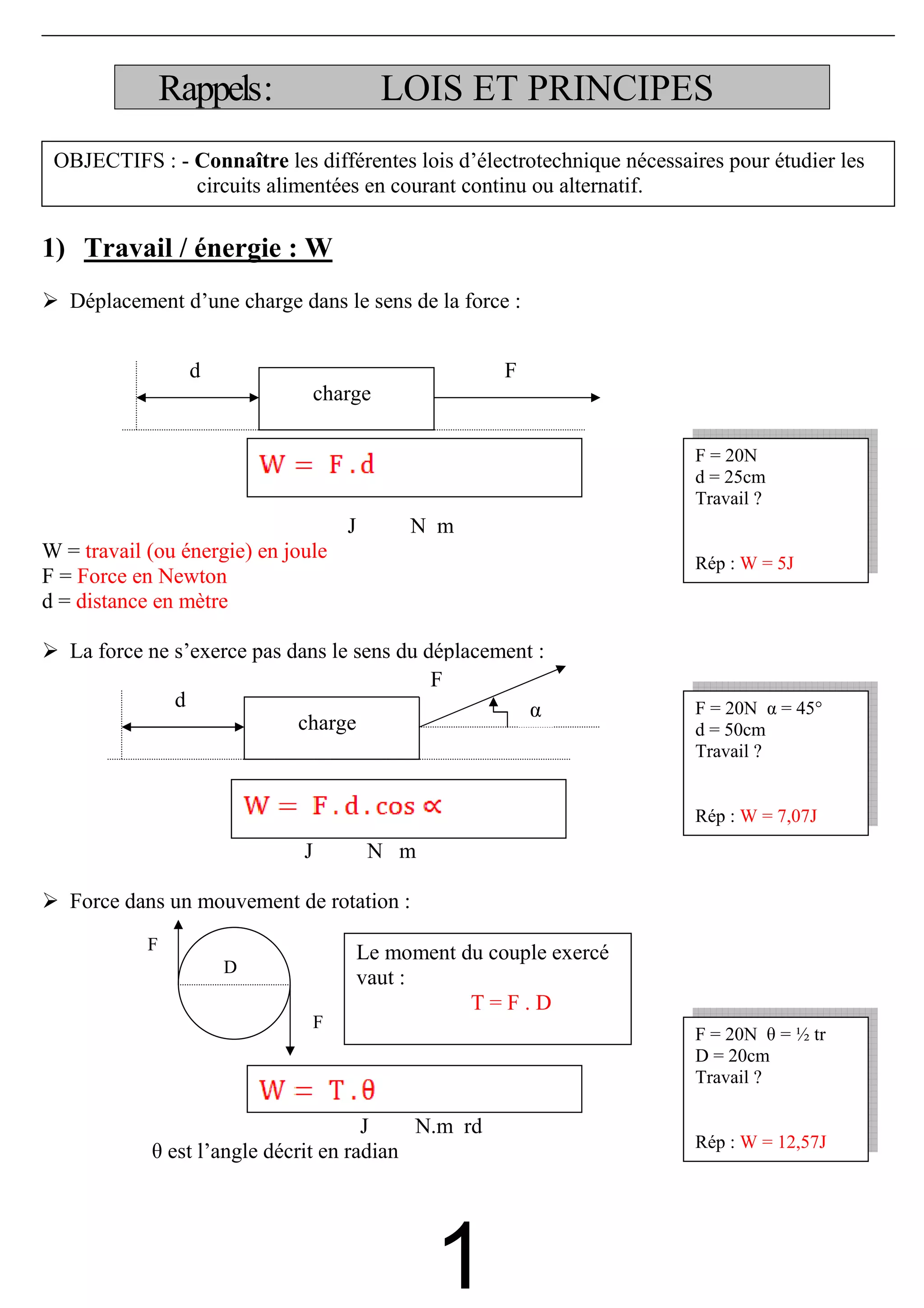 Le document traite des lois fondamentales de l'électrotechnique, y compris le travail, la puissance, l'intensité, la tension, la résistance électrique et le comportement des condensateurs et générateurs. Il aborde également les circuits en courant alternatif et les concepts de puissance active, réactive et apparente, ainsi que la compensation du facteur de puissance et les circuits triphasés. Les différentes formules et relations mathématiques sont détaillées pour faciliter l'étude des circuits électriques.