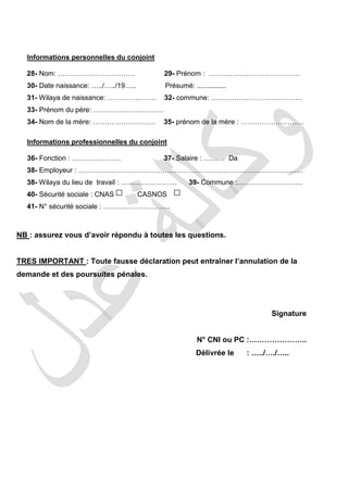 Le document présente un formulaire de mise à jour pour les citoyens ayant soumis une demande de logement en 2001 et 2002 dans le cadre du programme de location-vente AADL, en attente de paiement de l'apport initial. Il recueille des informations personnelles et professionnelles du demandeur et de son conjoint, ainsi que des détails sur leur situation familiale et économique. Une mention importante indique que toute fausse déclaration peut entraîner l'annulation de la demande et des poursuites pénales.
