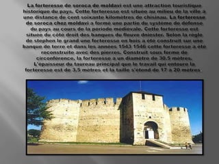La forteresse de Soroca, visitée par le tsar Pierre le Grand en 1711, est un monument historique médiéval unique en Moldavie, ayant servi de refuge pendant de nombreux sièges. La légende de la cigogne blanche symbolise la bonté et la prospérité pour les habitants de Soroca. Architecturale, la forteresse présente une structure circulaire avec cinq tours, ayant été conçue pour résister à plusieurs attaques à travers les siècles.
