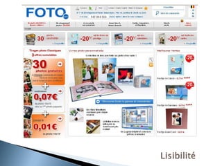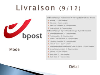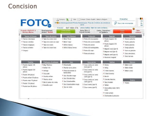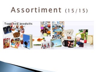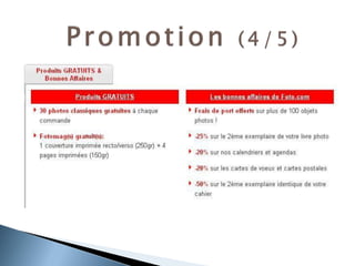 Le document analyse les performances d'une plateforme de e-commerce durant l'année académique 2010-2011, en fournissant des détails sur les coûts de différents services comme l'envoi de photos et de livres personnalisés. Les évaluations de divers aspects tels que le paiement, la livraison, l'ergonomie, et la promotion sont également abordées, avec un score global de 7,5 sur 10. La livraison des produits, la qualité de l'ergonomie et les aspects sociaux sont notés assez bas comparativement à d'autres critères.
