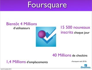 Foursquare est un réseau social basé sur la géolocalisation qui permet aux utilisateurs de partager leur emplacement et d'interagir avec leurs amis tout en accumulant des points et des badges pour leurs 'check-ins'. Avec environ 4 millions d'utilisateurs et une utilisation croissante par les entreprises pour le marketing interactif, Foursquare offre également des opportunités de promotion via des récompenses pour les utilisateurs actifs. Le retour sur investissement pour les entreprises peut être mesuré en termes de fréquentation et de satisfaction des clients, bien que les résultats puissent être souvent qualitatifs plutôt que quantitatifs.