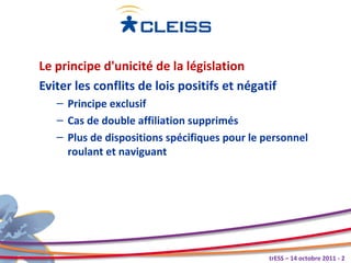 Ce document traite des principes de législation concernant le détachement et la pluri-activité, visant à éviter les conflits de lois liées aux activités salariées et non salariées. Il aborde les conditions d'application de la législation selon le lieu de travail, la notion de résidence, et les exceptions spécifiques pour certaines professions. Le texte souligne également l'importance de la coopération européenne pour s'adapter aux nouvelles réalités de travail multiple dans différents États.