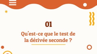 Le test de la dérivée seconde est un outil utilisé pour analyser le comportement d'une fonction autour des points critiques en utilisant la dérivée seconde f''(x). Il permet de déterminer si ces points sont des minima locaux, des maxima locaux ou des points de selle, selon que f''(x) est positif, négatif ou nul. L'application pratique de ce test sur une fonction donnée illustre la façon de trouver et d'interpréter les points critiques.