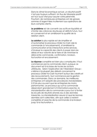 Le livre blanc présente sept raisons pour automatiser le traitement des commandes, notamment pour améliorer le flux de trésorerie, réduire les coûts, et renforcer les relations clients. L'automatisation simplifie le processus order-to-cash, garantissant des données précises et une réactivité accrue face aux demandes des clients. En intégrant ces solutions, les entreprises peuvent optimiser leurs performances financières et se conformer aux exigences réglementaires.