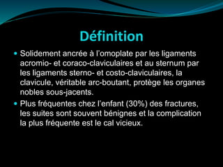 La clavicule, os en forme de 's', joue un rôle clé dans la protection des organes sous-jacents et est souvent sujet à des fractures, surtout chez l'enfant. Les traumatismes résultent principalement de chutes ou de chocs directs, avec des fractures fréquentes au 1/3 moyen. Le traitement peut être orthopédique ou chirurgical, selon la gravité de la fracture, avec un suivi des complications potentielles comme le cal vicieux.