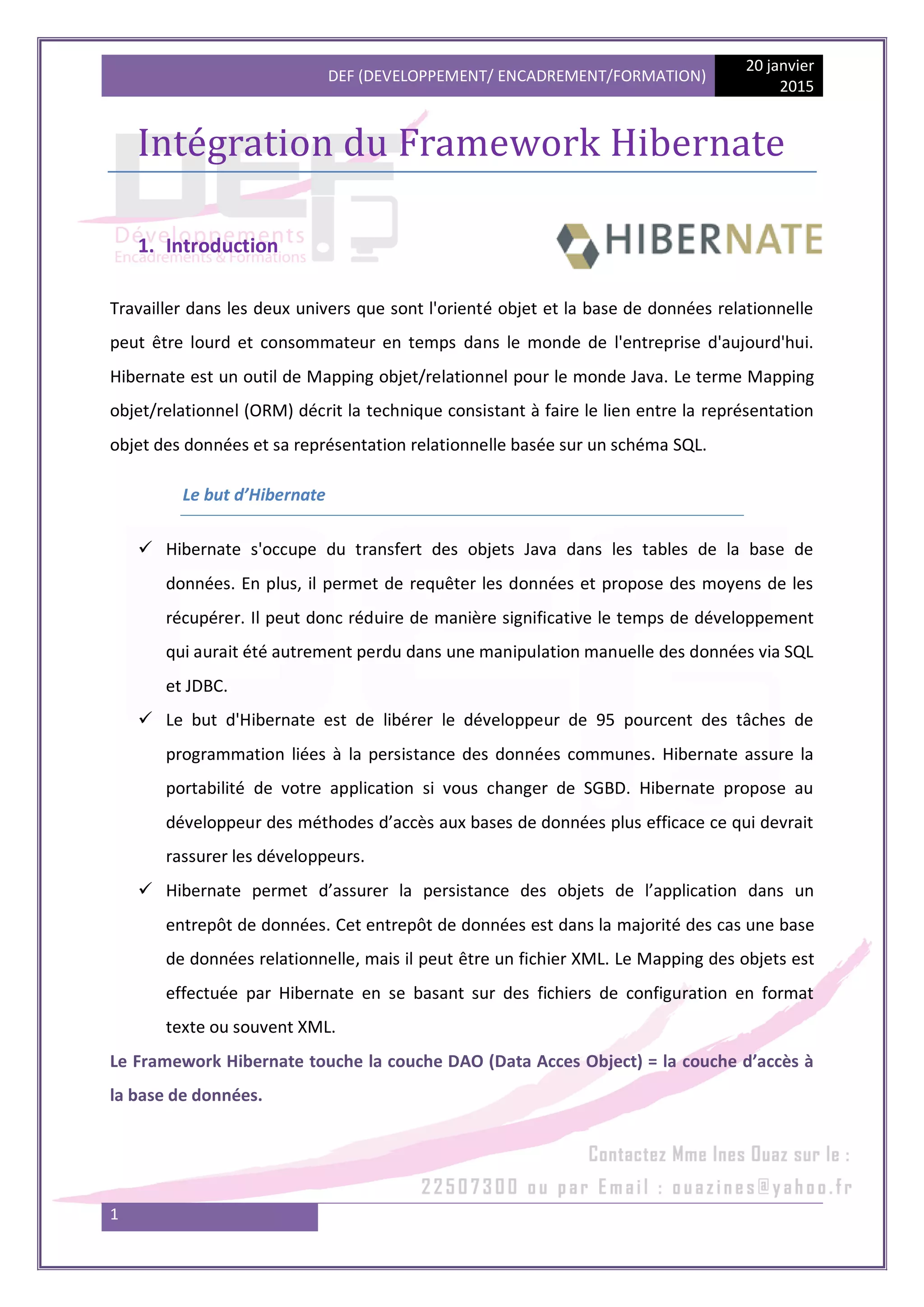 Le document décrit l'intégration du framework Hibernate pour le mapping objet/relationnel dans une application Java, facilitant la persistance des données dans une base de données relationnelle. Il présente la structure du projet, notamment les différentes couches (présentation, métier, DAO) et le processus de création de la classe de persistance ainsi que les fichiers de configuration nécessaires. Enfin, il évoque l'utilisation d'annotations pour simplifier la gestion des mappings au lieu des fichiers XML.