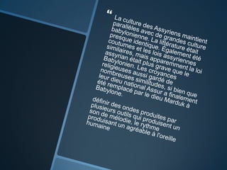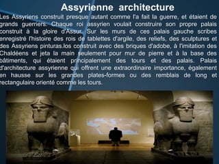 La religion assyrienne était caractérisée par un grand panthéon de dieux, dont Ashur et Ishtar, et marquée par une peur constante des esprits. L'architecture assyrienne comportait de grands palais et ziggourats, souvent décorés de briques vernissées, et de riches reliefs racontant l'histoire des rois. Le peuple assyrien utilisait une écriture cunéiforme sur des tablettes d'argile et avait des compétences artisanales dans la fabrication d'outils à partir d'obsidienne et de silex.