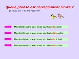 Le document est un test de langue française qui évalue la maîtrise de l'orthographe, de la grammaire, du vocabulaire et des conjugaisons à travers différentes questions à choix multiples. Chaque question demande à l'utilisateur de sélectionner la phrase ou la forme correcte parmi plusieurs options. Les thèmes abordés comprennent les accords de verbes et d'adjectifs, l'utilisation correcte de participes passés et d'infinitifs, ainsi que des règles liées aux adjectifs de couleur et aux adjectifs composés.