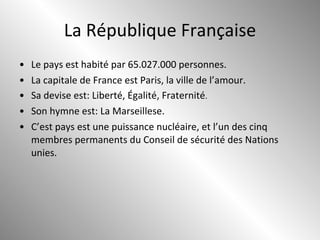 La France, avec une population de 65 millions d'habitants, est une république dont la capitale est Paris et qui possède une riche histoire marquée par des révolutions et des guerres mondiales. Réputée pour sa cuisine raffinée et son art influent, la France abrite de célèbres chefs et de nombreux peintres renommés. Le pays est également un centre culturel avec des musées prestigieux tels que le Louvre et le musée d'Orsay.