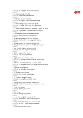 Le document contient une liste de phrases traduites de l'espagnol au français, abordant des thèmes variés allant des interactions quotidiennes aux descriptions de situations. Chaque phrase présente une correspondance entre les deux langues, illustrant des actions, des émotions et des environnements. L'ensemble vise à faciliter l'apprentissage et la compréhension des deux langues.