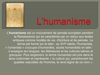 L'humanisme est un mouvement européen de la Renaissance qui privilégie les textes antiques comme modèles de pensée et d'écriture. Ce courant, né en Italie avec des figures comme Pétrarque et Lorenzo Valla, prône l'étude des humanités et la recherche de la vérité historique à travers une approche philologique. L'humanisme s'est ensuite diffusé à travers toute l'Europe, influençant la culture et les idées de l'époque.