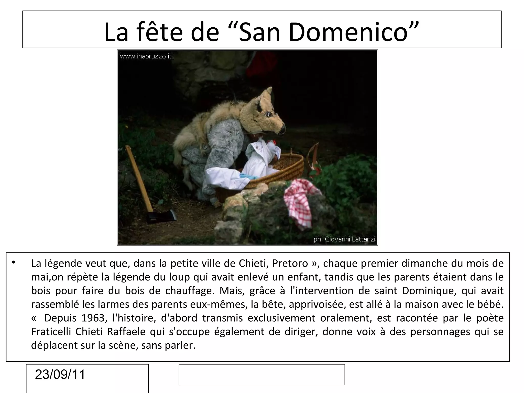 Le document décrit plusieurs fêtes traditionnelles de la région de Chieti, en Italie, comprenant des légendes et des pratiques associées, telles que la fête de San Domenico et la fête de Saint Justin. Chaque célébration est marquée par des rituels uniques et des processus historiques qui varient au fil du temps. Le texte met en lumière l'importance culturelle et religieuse de ces événements pour la communauté locale.