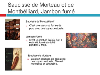 Le document présente une sélection de spécialités culinaires de la Franche-Comté, telles que la saucisse de Montbélliard, le jambon fumé, et des plats comme le coq au vin jaune. Il décrit également des fromages régionaux comme le Mont d'Or et le Comté, ainsi que des desserts comme la tarte aux myrtilles. Enfin, il mentionne l'anis de Pontarlier, un apéritif traditionnel.