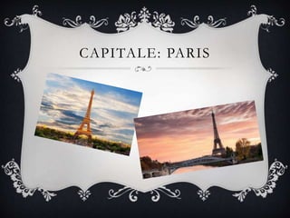 Le document présente des informations sur la France, y compris sa capitale, sa langue, son régime politique, sa monnaie et sa population. Il décrit également le climat, les reliefs, ainsi que des éléments culturels comme le drapeau et l'hymne national. Les données sont basées sur des sources comme Wikipedia et Contexreverso.