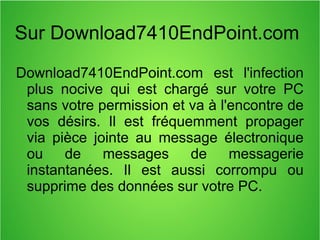 Download7410endpoint.com est un malware nocif qui pénètre les ordinateurs sans permission, souvent via des emails ou des logiciels gratuits. Il peut corrompre des données, masquer d'autres programmes malveillants et nécessite des outils de suppression spécialisés pour son élimination. Les utilisateurs peuvent suivre des étapes manuelles pour le désinstaller ou utiliser des logiciels de suppression pour protéger leur système contre des menaces similaires.