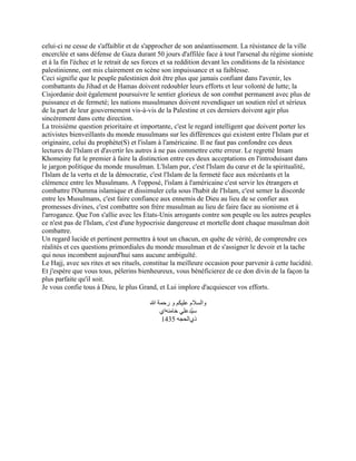 Le discours souligne l'importance du hajj comme un rituel de purification et d'unité pour la communauté musulmane, tout en encourageant une prise de conscience des enjeux mondiaux, notamment l'unité islamique et la lutte contre le sionisme. Il appelle à la solidarité entre les musulmans face aux défis contemporains, en insistant sur la distinction entre l'islam pur et l'islam américain qui soutient des intérêts étranges. Le hajj est présenté comme une opportunité pour renforcer cette lucidité et se concentrer sur les véritables valeurs de l'islam.