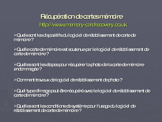 Le document traite du logiciel de récupération de cartes mémoire, en expliquant les dispositifs et types de cartes compatibles, ainsi que les étapes pour récupérer des photos à partir de cartes endommagées. Il mentionne également les formats d'image acceptés et les exigences système nécessaires pour faire fonctionner le logiciel. Enfin, il fournit des instructions sur le fonctionnement du logiciel pour retrouver et restaurer les fichiers perdus.