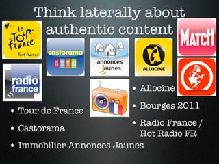 Le document présente des applications adaptées à une classe de français, mettant l'accent sur du contenu authentique. Il évoque des ressources variées comme Allociné, le Tour de France, et des outils pour jouer avec les mots et apprendre les langues. Il encourage également la création d'applications personnalisées pour enrichir l'apprentissage.