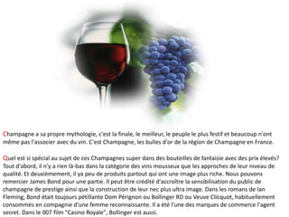 Le document explore l'univers des champagnes français, en mettant en lumière leur prestige, leur qualité exceptionnelle et leur association avec des marques emblématiques. Il souligne l'importance des raisins provenant de villages classés en fonction de leur qualité, ainsi que les standards rigoureux de production pour les cuvées de prestige. Enfin, il mentionne la diversité des styles de champagnes et l'impact du vieillissement sur leur valeur et leur saveur.