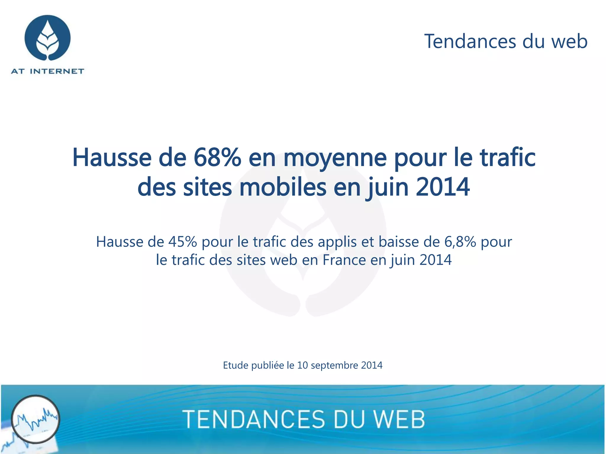 En juin 2014, le trafic des sites mobiles en France a augmenté en moyenne de 68%, tandis que celui des applications a augmenté de 45%, en contraste avec une baisse de 6,8% pour les sites web. Cette tendance à la hausse des sites mobiles et des applis est alimentée par un nombre croissant d'utilisateurs de smartphones et un usage accru du m-commerce. Alors que 66% des sites web enregistrent une baisse de leur trafic, près des trois quarts des sites mobiles et deux tiers des applications voient leur fréquentation augmenter.