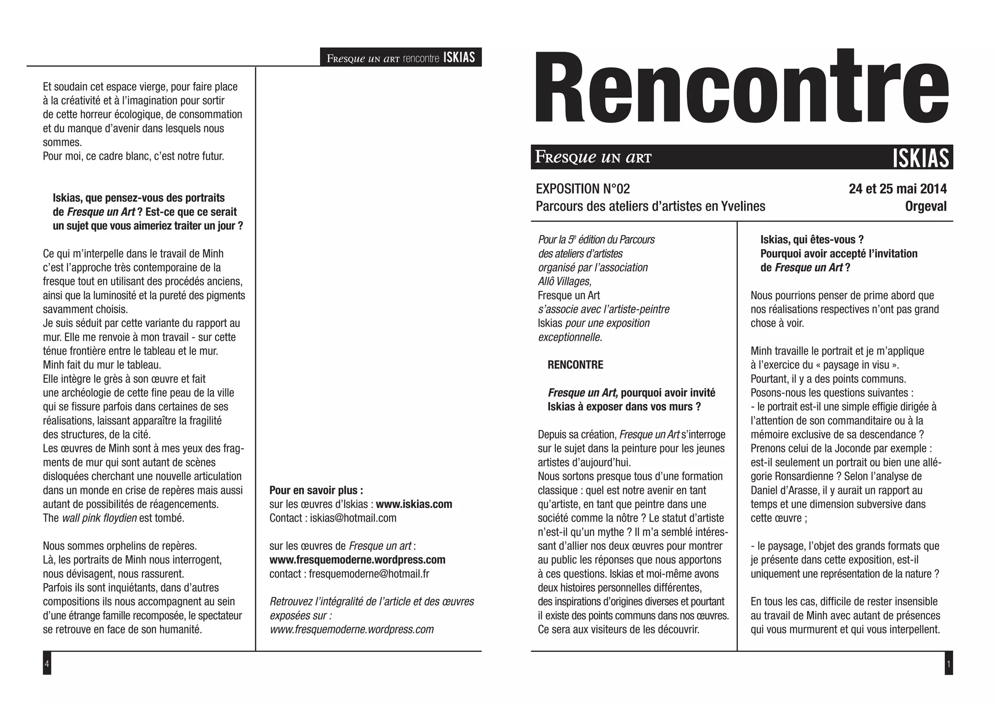 L'exposition organisée par Fresque Un Art et l'artiste Iskias interroge le statut d'artiste dans la société contemporaine et explore les liens entre portrait et paysage à travers leurs œuvres. Les artistes, aux inspirations différentes, s'efforcent d'engager le public en questionnant les modèles de modernité et le sens de l'art. La thématique des 'frontières' dans les œuvres d'Iskias renvoie à la complexité des représentations artistiques face à un monde en crise de repères.