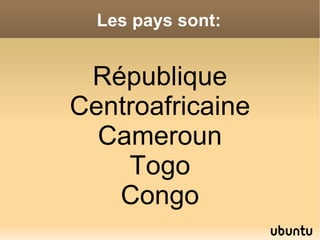 Le document présente un aperçu des ressources naturelles dans plusieurs pays d'Afrique francophone, notamment la République centrafricaine, le Cameroun, le Togo et le Congo, en se concentrant sur la production de diamants, de pétrole, de fer, et de coltan. Il souligne l'impact de l'exploitation illégale de ces ressources et ses conséquences socio-économiques, telles que la corruption et le travail des enfants. Des remerciements sont également adressés aux personnes ayant contribué à l'élaboration du document.