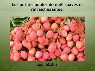 Le document évoque divers fruits de La Réunion, notamment les letchis, les mangues José et les fruits de la passion. Il souligne également la fraîcheur et la douceur des fruits, en mentionnant leur dégustation agréable. Enfin, il fait référence à d'autres fruits tropicaux comme le baba figue.