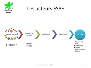 Le document traite de l'organisation et des actions de la Fédération des Syndicats Pharmaceutiques de France (FSPF) et de ses syndicats départementaux en Bretagne et Pays de la Loire. Il met en avant les différents acteurs, commissions et actions menées pour défendre la profession de pharmacien, ainsi que les services offerts aux professionnels. La FSPF appelle à l'adhésion pour renforcer la défense de la pharmacie auprès des instances compétentes.