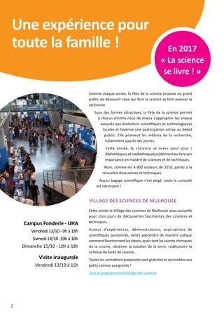 La Fête de la Science 2017 dans le Haut-Rhin invite le public à découvrir les sciences et la recherche à travers des animations variées, sans nécessité de bagage scientifique. Le village des sciences de Mulhouse propose des expériences ludiques du 13 au 15 octobre, avec des activités gratuites pour toute la famille. Cette édition met en avant la thématique « La science se livre », impliquant 11 médiathèques locales, et est soutenue par divers partenaires institutionnels.