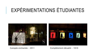 Le document traite des participations étudiantes aux festivités de la fête des lumières à Lyon entre 2010 et 2012, avec plusieurs expérimentations comme 'canopée enchantée' et 'génie phonique'. Chaque année a présenté des projets distincts qui ont enrichi cet événement culturel. Ces contributions étudiantes témoignent de la créativité et de l'innovation dans le cadre de la célébration.