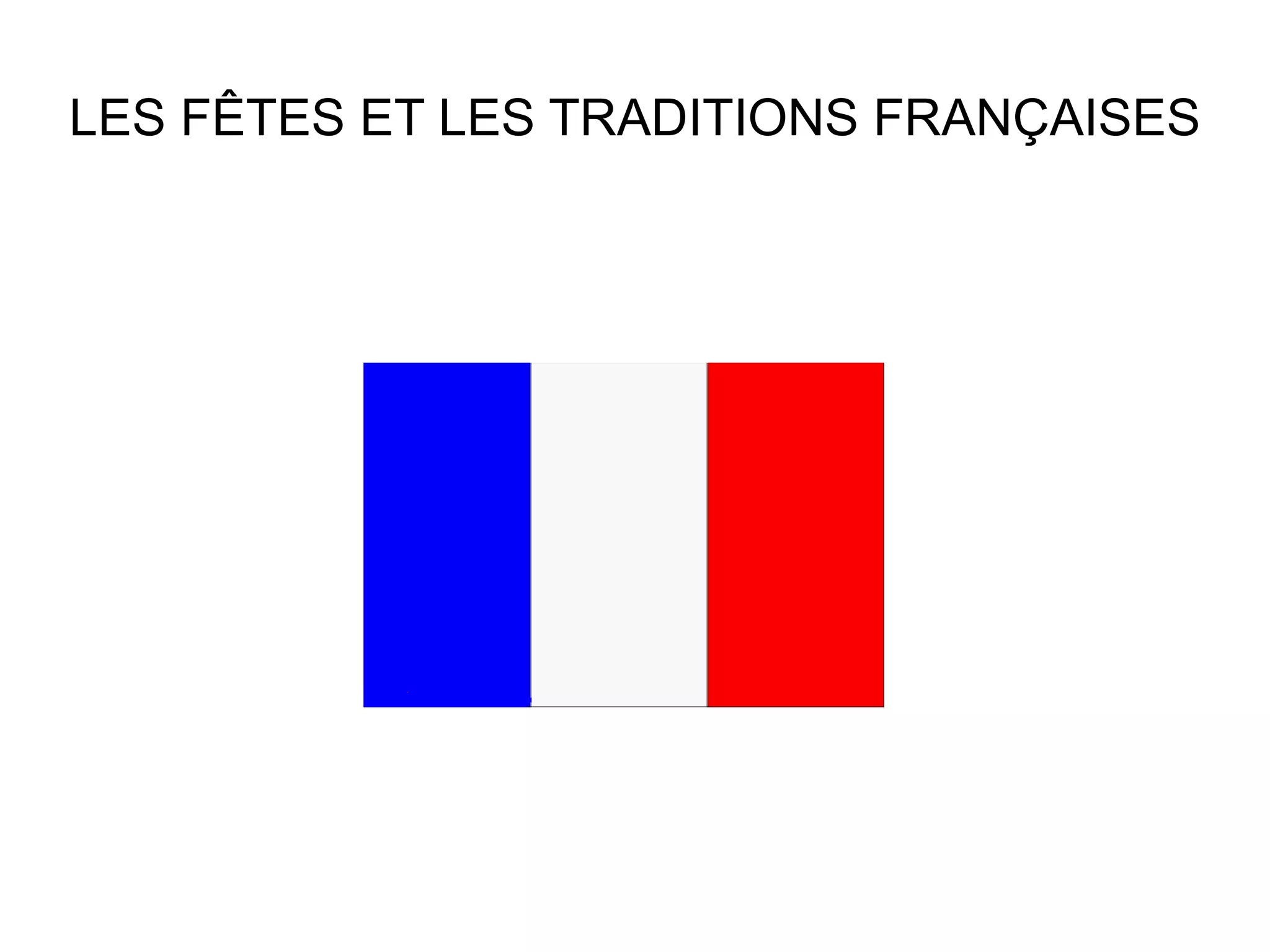 Le document décrit les principales fêtes et traditions françaises tout au long de l'année, telles que l'Épiphanie, la Chandeleur, Mardi Gras, Pâques, et Noël. Chaque fête est associée à des coutumes spécifiques, comme la galette des rois, la confection de crêpes ou les célébrations de feux d'artifice. Ces traditions reflètent la richesse culturelle de la France et l'importance des rassemblements familiaux et festifs.