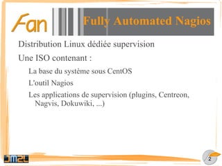Le document présente une distribution Linux automatisée de Nagios pour la supervision des systèmes, incluant divers outils comme Centreon, Nagvis et Dokuwiki. Il explique les raisons de la supervision, les éléments surveillés, et met en avant l'écosystème de Nagios ainsi que les avantages de l'utilisation de FAN pour une installation pré-configurée. En outre, il décrit l'architecture distribuée de la version 2.0 de FAN et remercie les contributeurs du projet.