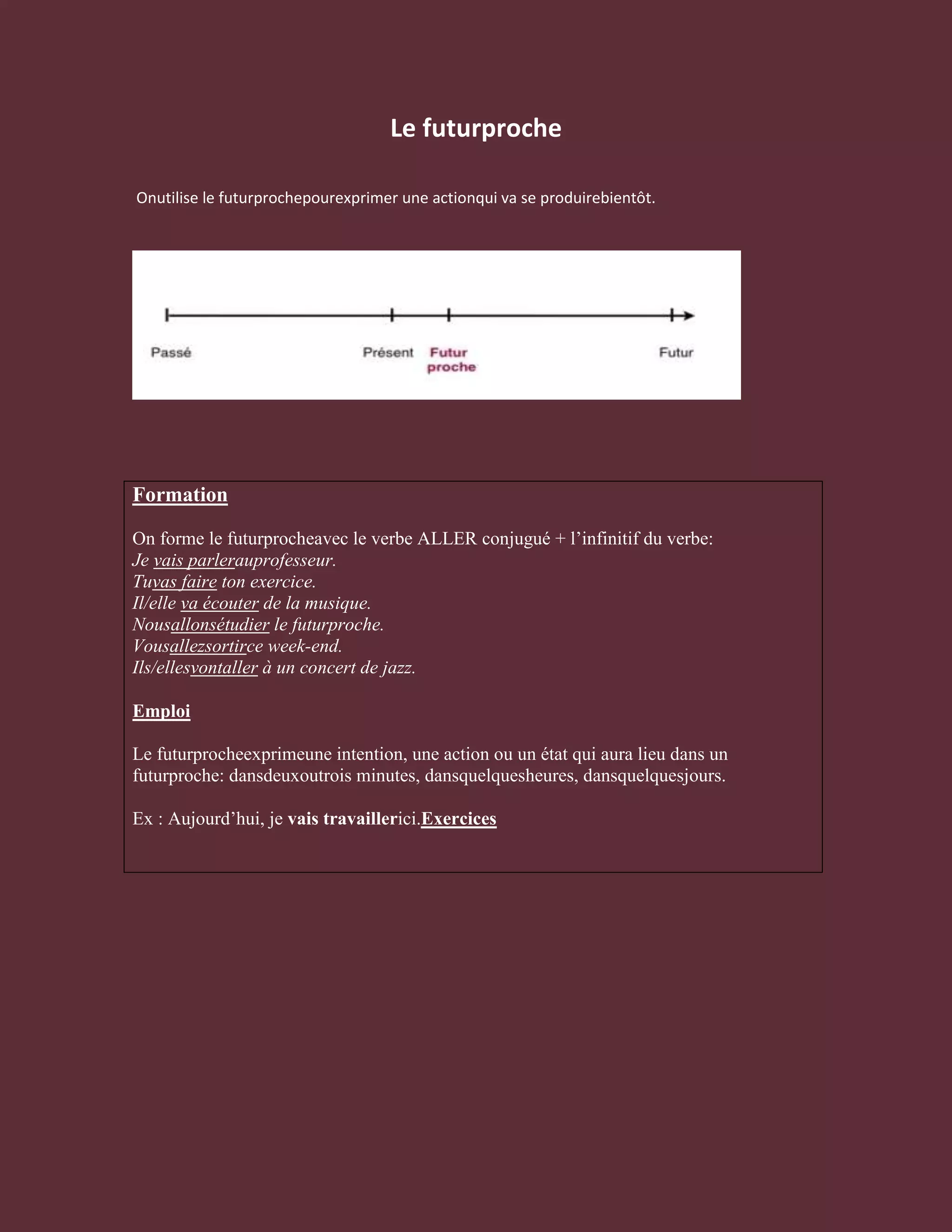 Le futur proche est utilisé pour exprimer une action imminente, formé par le verbe 'aller' conjugué suivi de l'infinitif. Il indique une intention ou un événement à venir dans un avenir proche. Des exemples de phrases illustrent cette construction, y compris sa forme négative.