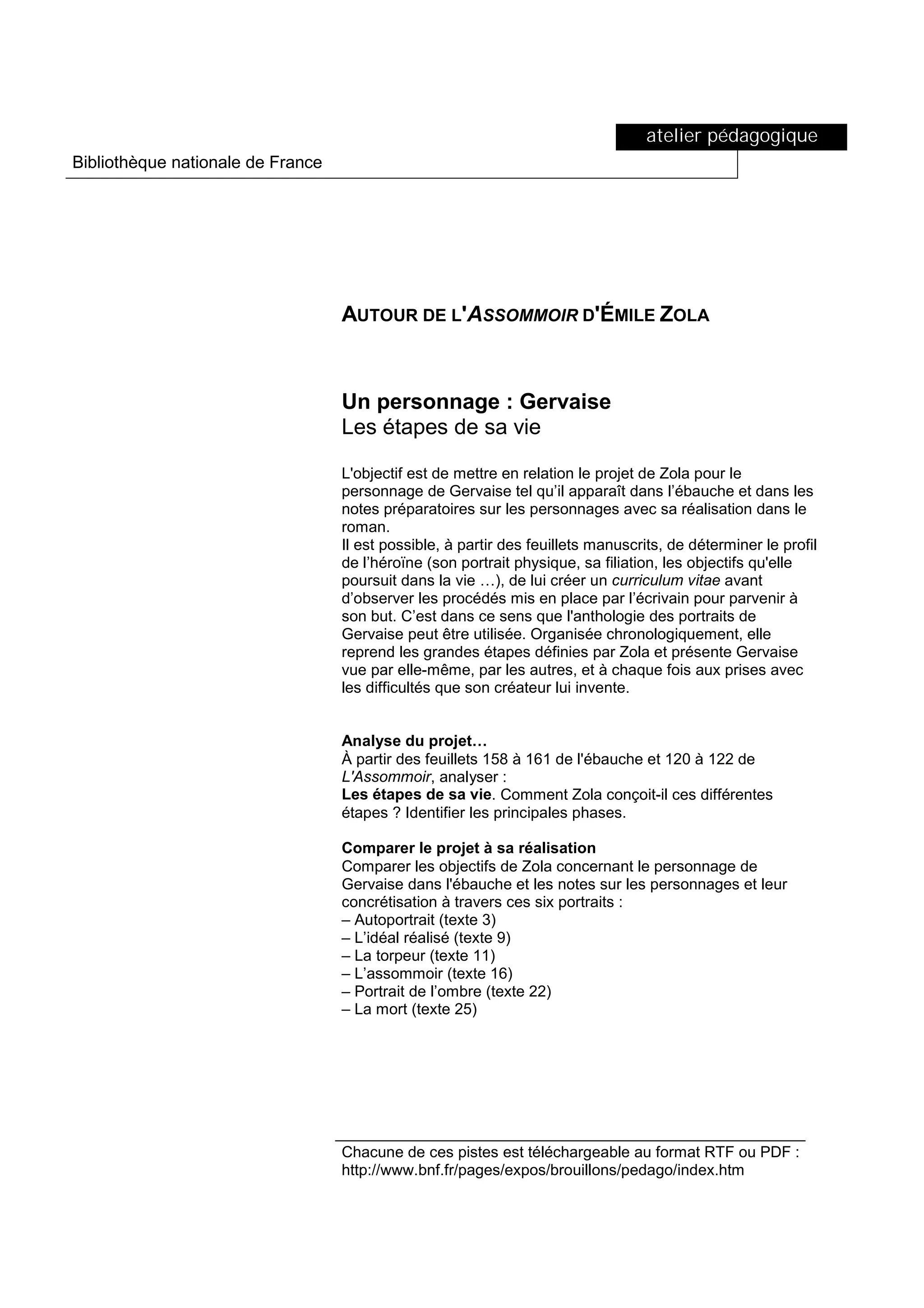 L'atelier pédagogique de la Bibliothèque nationale de France explore le personnage de Gervaise dans 'L'Assommoir' d'Émile Zola, en analysant son évolution à travers les ébauches et notes préparatoires de l'auteur. Le projet vise à mettre en relation le profil de Gervaise et les procédures d'écriture de Zola, tout en examinant les grandes étapes de sa vie présente dans différents portraits. Les participants étudieront les thèmes de la misère ouvrière, des relations humaines et des aspirations de Gervaise, considérée comme une héroïne du peuple.