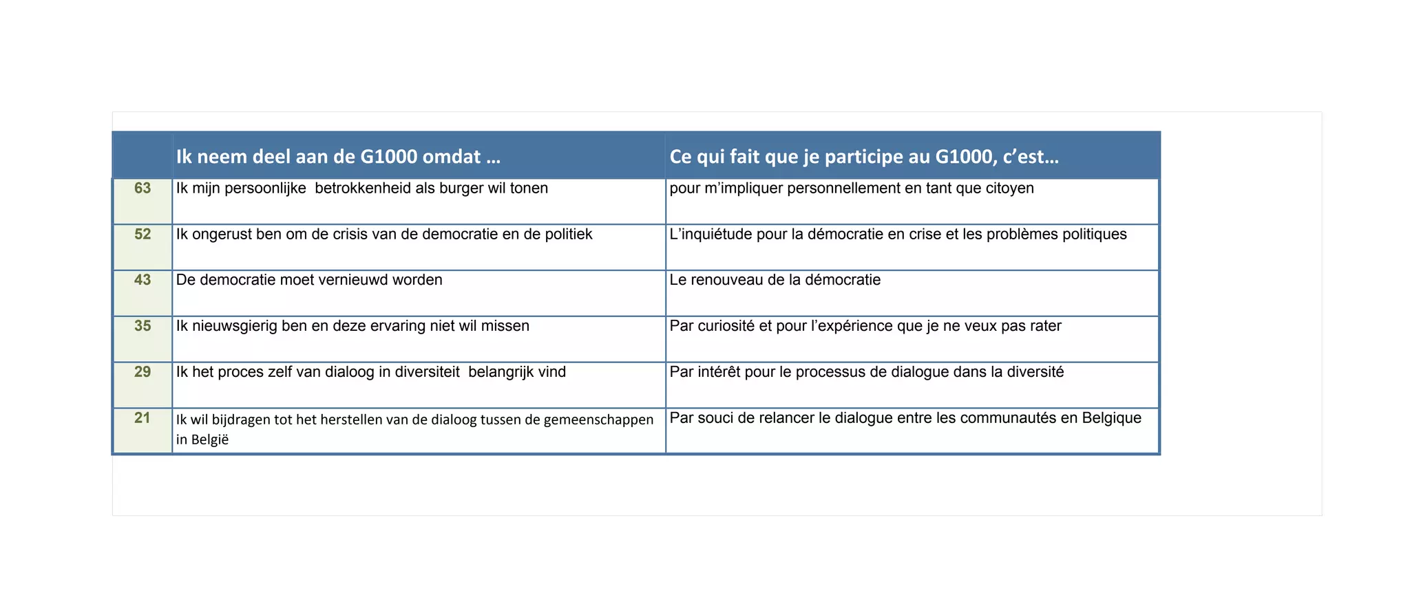 Le document aborde la participation au G1000, une initiative citoyenne visant à renouveler la démocratie et à améliorer le dialogue entre les communautés en Belgique. Plusieurs thèmes sont discutés, y compris l'emploi, les pensions, les allocations familiales, les soins de santé et l'immigration, avec des propositions spécifiques pour chaque sujet. Les participants expriment leur volonté de s'impliquer activement pour aborder les crises démocratiques et politiques actuelles.