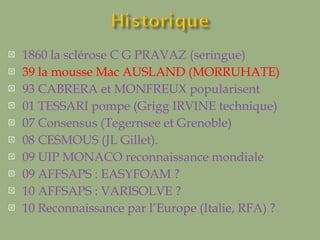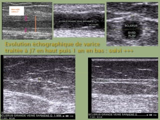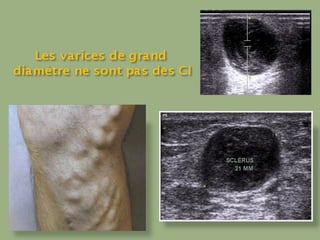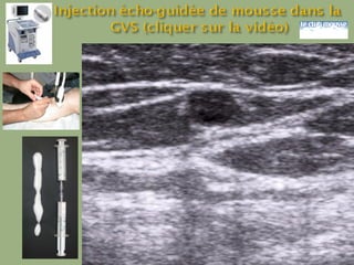 Le document traite du traitement des varices par injections de mousse sclérosante, détaillant les avantages, les indications et les contre-indications de cette méthode. Il souligne que la technique est efficace, ambulatoire, moins coûteuse et préserve le réseau veineux, tout en nécessitant une évaluation préalable par échographie. Les différentes précautions, ainsi que la formation des praticiens, sont également abordées pour assurer la sécurité et l'efficacité du traitement.
